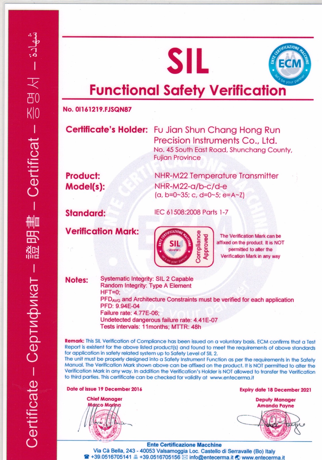 SIL2認證,是國際上公認的一種功能安全認證,英文全稱:Safety integrity Level—安全完整性等級。是根據國際電工委員會IEC頒布的功能安全標準IEC 61508(已轉化為國標GB/T 20438歸口標委會SAC/TC124/SC10)中對相關產品進行安全考核的認證要求。需要做SIL認證的產品,都是使用可能對人、環境或財產造成較高危害的場合,考核的主要目的也是,不能因為產品本身的功能問題,引起人員的傷害、環境污染和財產損失。