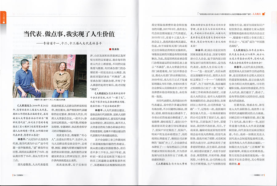 林善平:虹潤公司是民營的國家高新技術(shù)企業(yè)、國家專精特新小巨人企業(yè),處于國內(nèi)顯示控制儀表行業(yè)的領(lǐng)先地位。沒當(dāng)選代表前,我的人生目標(biāo)只有一個——“造一流儀表”,而自從跨進(jìn)議政履職平臺后,我的人生目標(biāo)又增加了一個——“當(dāng)稱職的代表”。為了當(dāng)好代表,我在履職之初就給自己劃了一條“底線”:本職工作和商務(wù)活動再忙,只要是人大的會議、省市人大組織的集體履職活動,就必定參加。如果時(shí)間上有沖突,公司的事就“讓路”一下。記得有一次,我到福州參加省人代會,一位客商在順昌的公司總部等了我好幾天,最后等不住,只好取消了合作。即便如此,我仍然不改初衷。而且,于我來說,履職對我更好地經(jīng)營管理企業(yè)有很大的幫助。擔(dān)任代表職務(wù),使我開闊了視野,對黨和國家的大政方針政策、法律法規(guī)有了更多更好的領(lǐng)會,民主意識、法治意識、誠信意識更強(qiáng)了,有助于辦好企業(yè)、規(guī)范管理、開拓市場、規(guī)避風(fēng)險(xiǎn)。10多年來,公司的核心競爭力不斷增強(qiáng),生產(chǎn)與銷售持續(xù)領(lǐng)跑全行業(yè),被評為國家知識產(chǎn)權(quán)優(yōu)勢企業(yè)、福建省七家入選國家智能制造標(biāo)準(zhǔn)應(yīng)用試點(diǎn)企業(yè)之一、福建省十家院士專家示范工作站之一,“虹潤”成為“中國馳名商標(biāo)”。