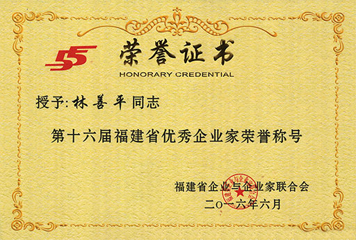 為弘揚(yáng)優(yōu)秀企業(yè)家深化改革、科學(xué)管理、與時(shí)俱進(jìn)、勇于創(chuàng)新的開(kāi)拓精神,激勵(lì)廣大企業(yè)家敢為天下先、愛(ài)拼才會(huì)贏的闖勁,為推動(dòng)福建省產(chǎn)業(yè)轉(zhuǎn)型升級(jí)和經(jīng)濟(jì)持續(xù)健康發(fā)展建功立業(yè),近日,福建省企業(yè)與企業(yè)家聯(lián)合會(huì)組織開(kāi)展了每?jī)赡暝u(píng)選一次的福建省優(yōu)秀企業(yè)家評(píng)選工作,并于2016年6月24日決定授予98位企業(yè)經(jīng)營(yíng)管理者“第十六屆福建省優(yōu)秀企業(yè)家”榮譽(yù)稱號(hào),虹潤(rùn)公司董事長(zhǎng)林善平榮獲該榮譽(yù)稱號(hào)。