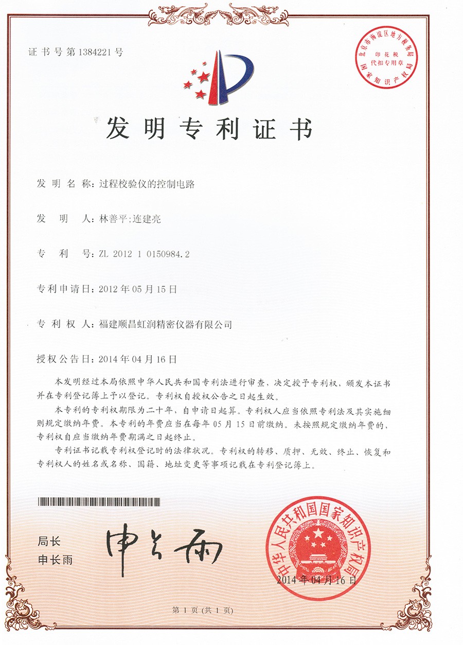 過程校驗(yàn)儀的控制電路 發(fā)明專利證書 |
