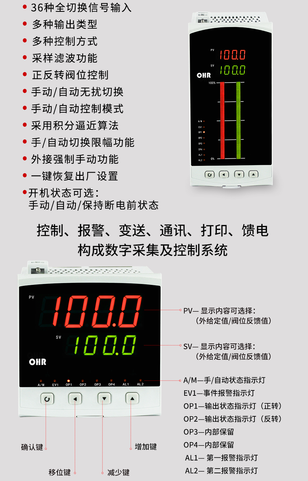同時按,儀表面板燈 A/M長亮時為手動SV屏顯示的數值可由0.0-100.0%可調,反之滅為自動。