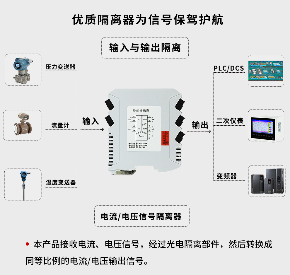 OHR-M31系列智能隔離器將直流電壓或電流信號經過隔離傳送,轉換成所需的信號給其它儀表。可以與單元組合儀表及DCS、PLC等系統配套使用,給予現場儀表信號隔離、信號轉換、信號分配、信號處理等,從而提高工業生產過程自動控制系統的抗干擾能力,保證系統的穩定性和可靠性。