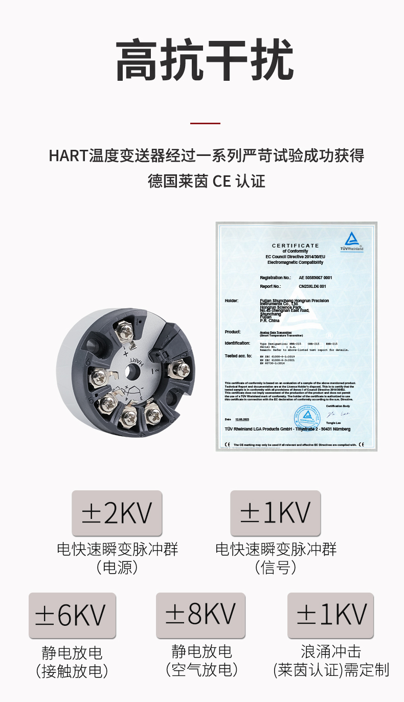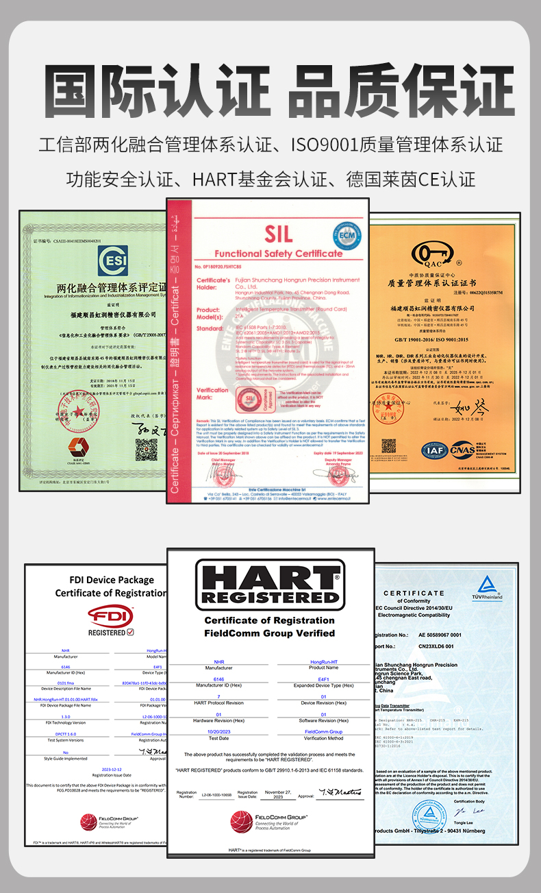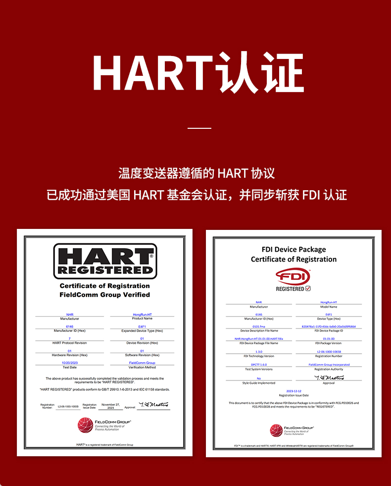 虹潤公司是專業生產溫度變送器的國家專精特新“小巨人”企業。生產的智能溫度變送器,具有適配各類溫度傳感器,精度高,通過編程線修改輸入信號類型及量程,高抗干擾,HART或485通訊等特點。該產品不僅通過HART基金會認證、德國萊茵 CE 認證與 SIL 功能安全認證,還獲得具備減震抗干擾能力的溫度變送器、信號隔離器、一種二端子模塊、無源信號隔離器等4項國家發明專利,主持起草物聯網智能溫度儀表、現場設備工具(FDT)接口規范、工業過程測量和控制系統用溫度變送器等3項國家標準,以及通信系統多通道數據采集控制終端規范軍用標準,參與國際5G標準制定,取得HART溫度變送器、智能溫度變送器等3項相關軟件著作權。產品廣泛應用于石油、化工、電力、冶金、制藥、食品、水處理等各種工業領域。。