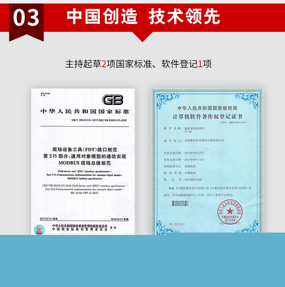 虹潤公司是專業生產溫度變送器的國家專精特新“小巨人”企業。生產的現場顯示隔離溫度變送器,具有可修改輸入信號類型,測量精度高,穩定性好,帶HART或RS485通訊計等特點。該產品不僅通過德國萊茵 CE 認證與 SIL 功能安全認證,還獲得具備減震抗干擾能力的溫度變送器、信號隔離器、一種二端子模塊、無源信號隔離器等3項國家發明專利。主持起草物聯網智能溫度儀表、現場設備工具(FDT)接口規范、工業過程測量和控制系統用溫度變送器等3項國家標準,以及通信系統多通道數據采集控制終端規范軍用標準。參與國際5G標準制定,取得高精度溫度變送器等3項相關軟件著作權。產品廣泛應用于石油、化工、電力、冶金、制藥、食品、水處理等各種工業領域。