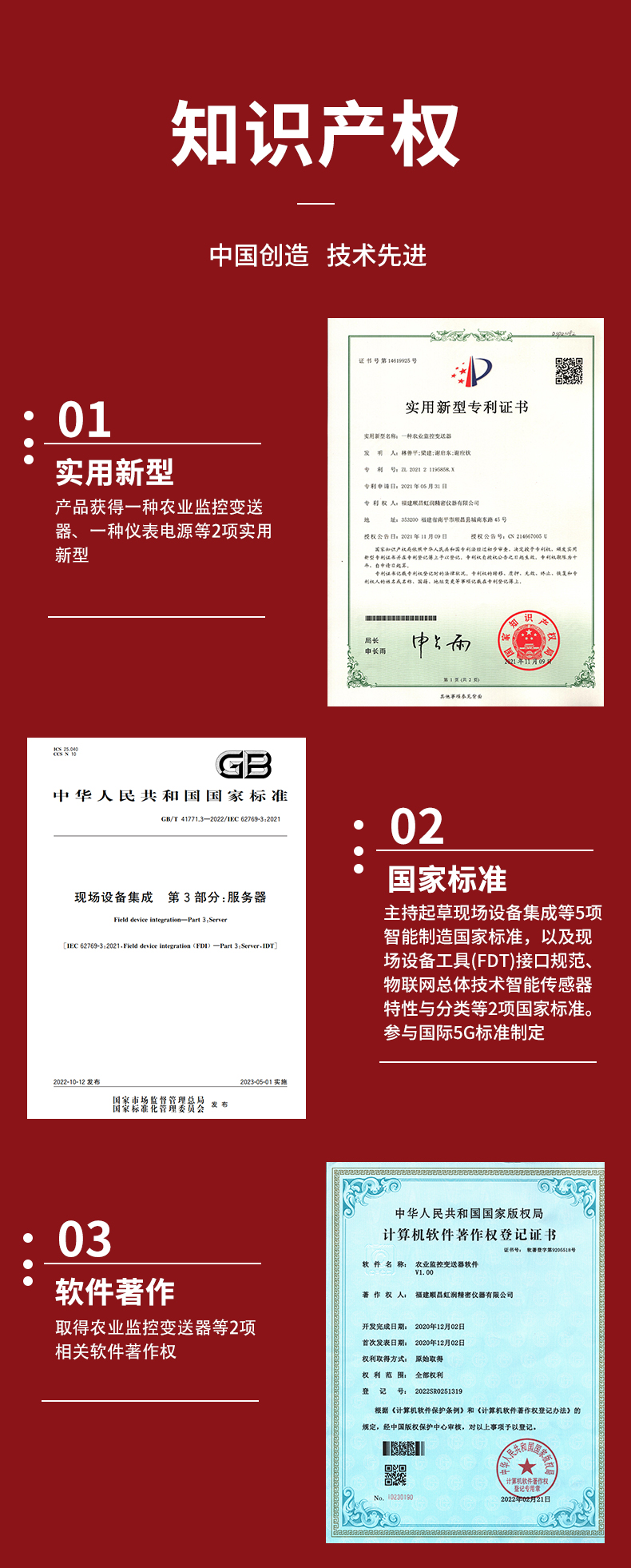 虹潤公司是專業生產環境監測儀表的國家專精特新“小巨人”企業。生產的二氧化碳變送器,具有新型紅外檢定技術,自動溫度補償,響應靈敏,低功耗,模擬量變送輸出或RS485通訊等特點。產品獲得一種農業監控變送器、一種儀表電源等2項實用新型專利,主持起草現場設備集成等5項智能制造國家標準,以及現場設備工具(FDT)接口規范、物聯網總體技術智能傳感器特性與分類等2項國家標準,參與國際5G標準制定,取得農業監測變送器等3項相關軟件著作權。產品廣泛應用于機房、配電站、地下車庫、工廠倉庫、食品儲存、養殖場、果蔬林園等環境場合對二氧化碳濃度的檢測。
